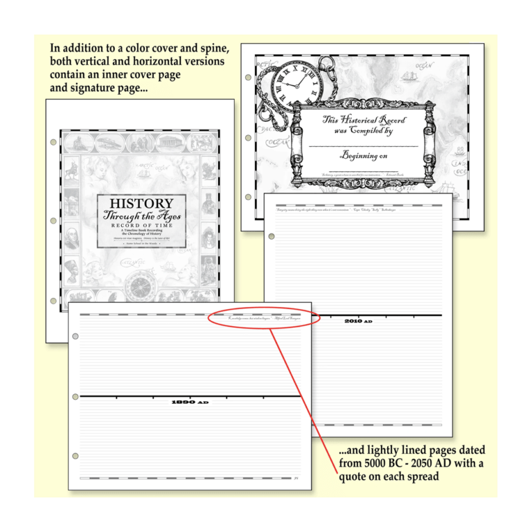 With the option to print pages horizontally or vertically, students can fill their “Record of Time” timeline notebook with homemade or pre-made timeline figures in the notebook style of their choice. (Full color cover art is provided to print—so students can insert an attractive cover on the binder. Binder not included in purchase.)